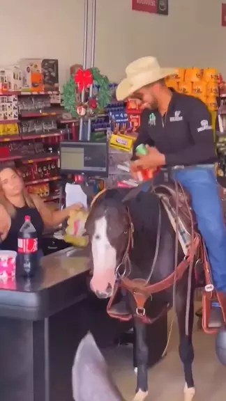 Drive-thru diferente 🤠 já pensou se essa moda pega? Cowboy indo fazer compra a cavalo! #pecuaria #cowboy #cavalo #compras #rodeo