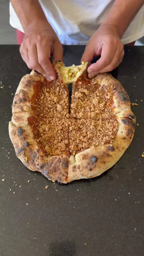 Pizza de Doce de Leite com Paçoquinha e borda de mozzarella com pistache. 😱 #pizza #pizzatime #pizzalover #cheese #asmr