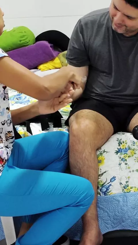 Fisioterapia com órtese: estimulando os dedos antes de usar a órtese de mão direita #Fisioterapia #ÓrteseDeMão #Reabilitação #ExercíciosParaIdosos #PósAVC