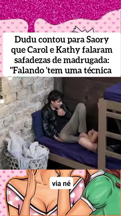 Dudu contou para Saory que Carol e Kathy falaram safadezas de madrugada: "Falando 'tem uma técnica que...' e eu não vi em detalhes, mas era relacionado a isso." Saory: "Mentira???" Dudu: "Aí a Kathy '😘😘😘'" kkkkkk #AFazenda